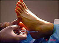 Se realiza una incisión en la piel lineal oblicua en el seno del tarso de 1,5 a 2,0 cm de largo. (fig.2)